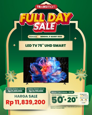 Transmart menawarkan diskon besar untuk LED TV 75 inch pada Full Day Sale. Dengan diskon hingga 70%, pelanggan dapat membeli dengan harga terjangkau.